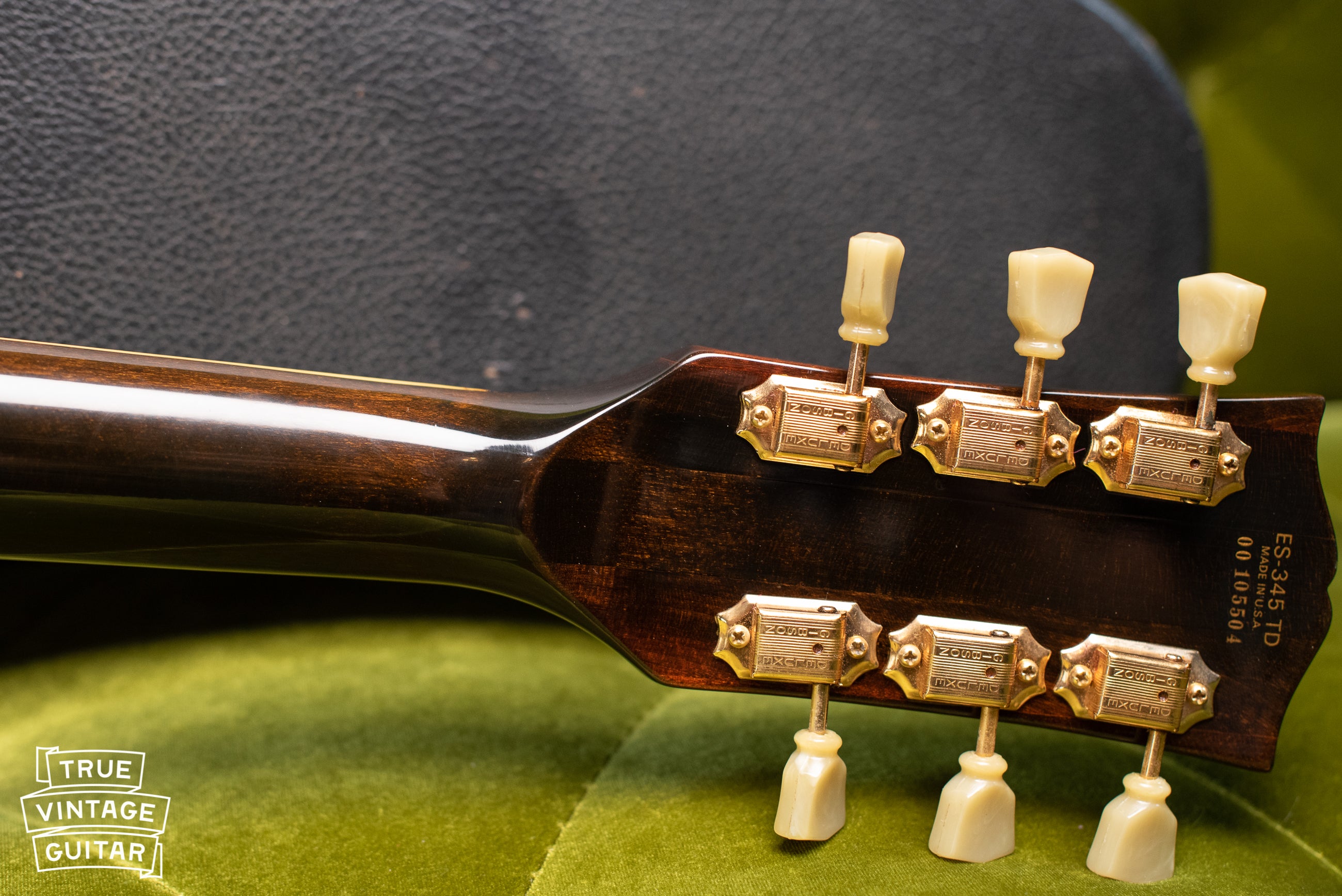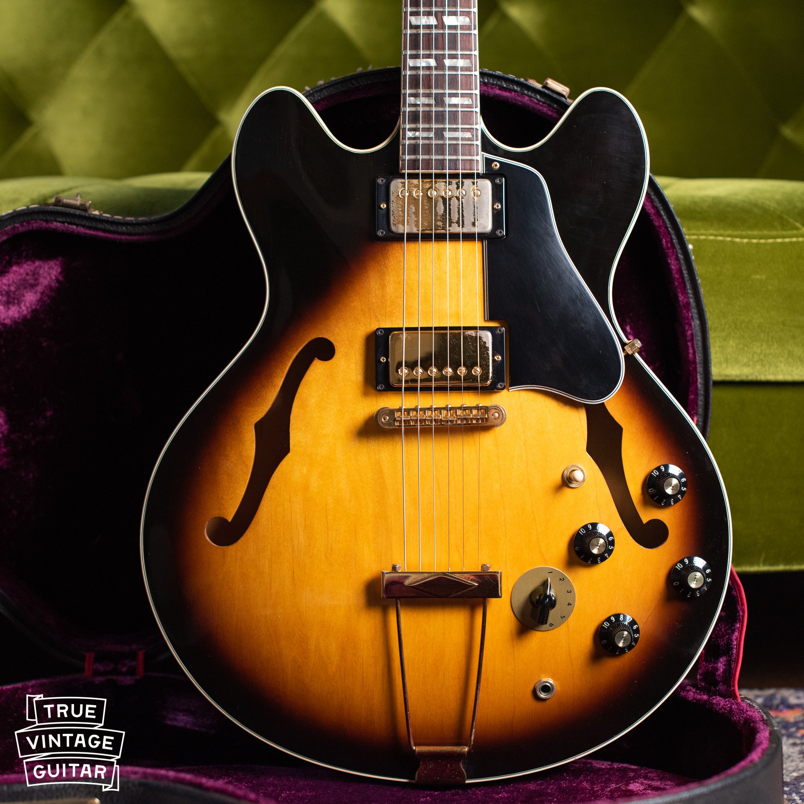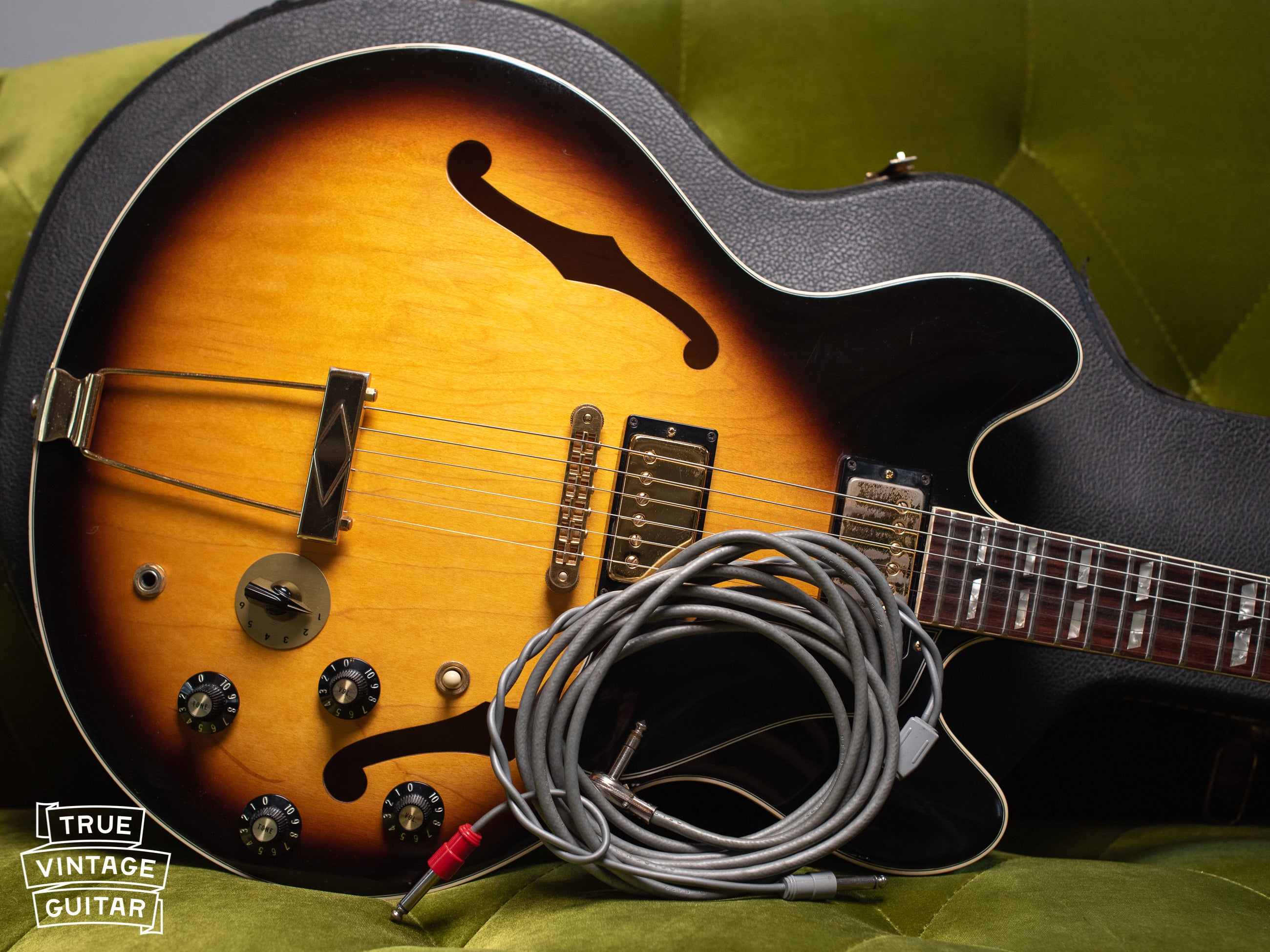 Gibson's ES-345 was the third of the three ES-3x5 series that began with the ES-335T in 1958. The ES-345's Stereo Varitone circuitry set it apart from the other two initially until the ES-355 began being produced in greater numbers with the same circuitry later that year. As the middle tier in the trio, the ES-345 featured upgraded split parallelogram fretboard inlays and gold hardware. Structurally, it was the same as the other two with a thinline archtop body with solid Maple center block to cut down on excessive feedback at high volumes. This example from 1976 bears a serial number indicating it was manufactured in the Nashville plant about a year after it opened. It also retains its original Switchcraft stereo cable which is so often left in the back of an amp!