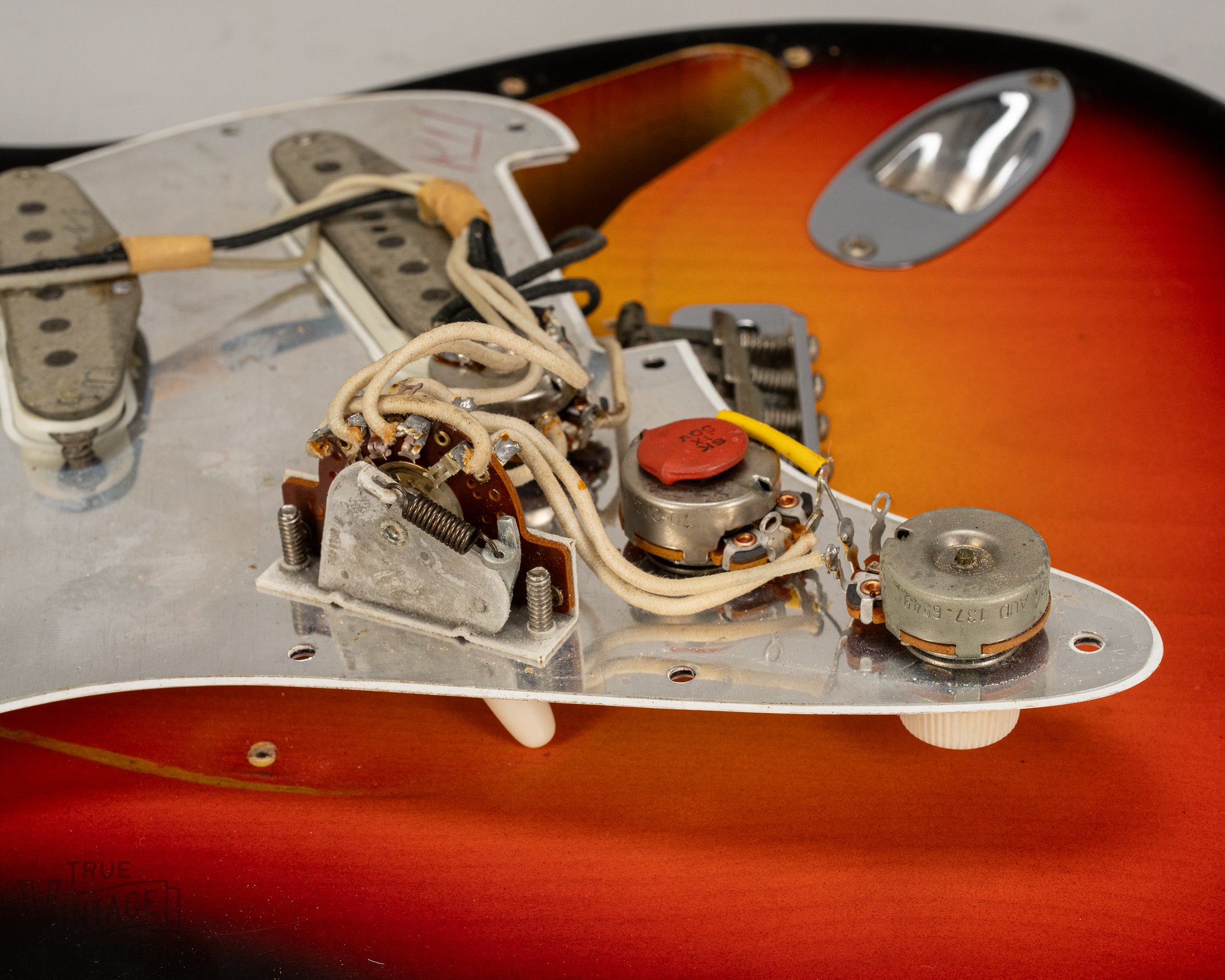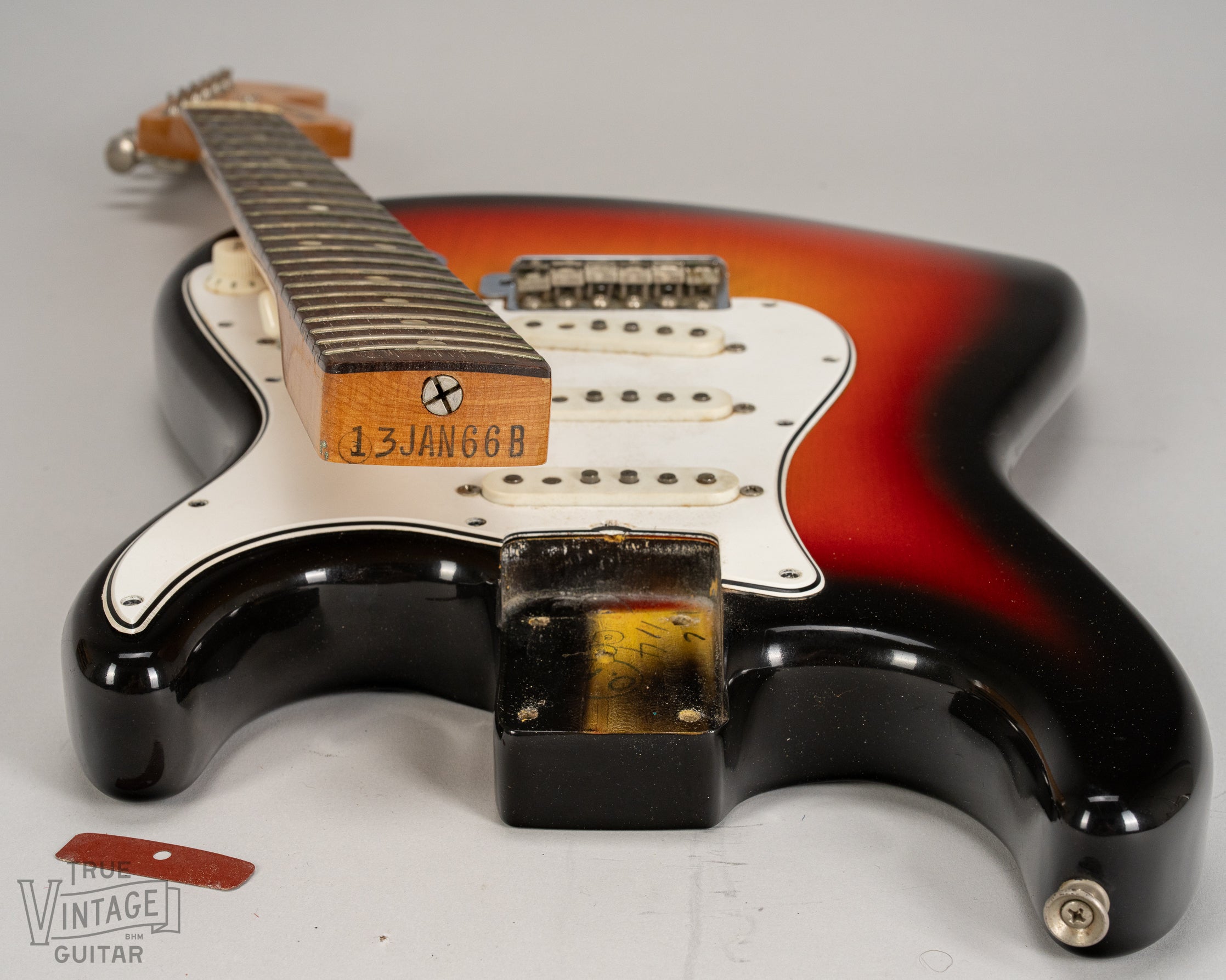 Dates: The neck heel stamp reads "13JAN66B" (13 = Stratocaster model, JAN = January, 66 = 1966, and B = standard neck width 1 5/8". The potentiometer codes read "137 6549" (137 = CTS, 65 = 1965, and 49 = 49th week of the year).