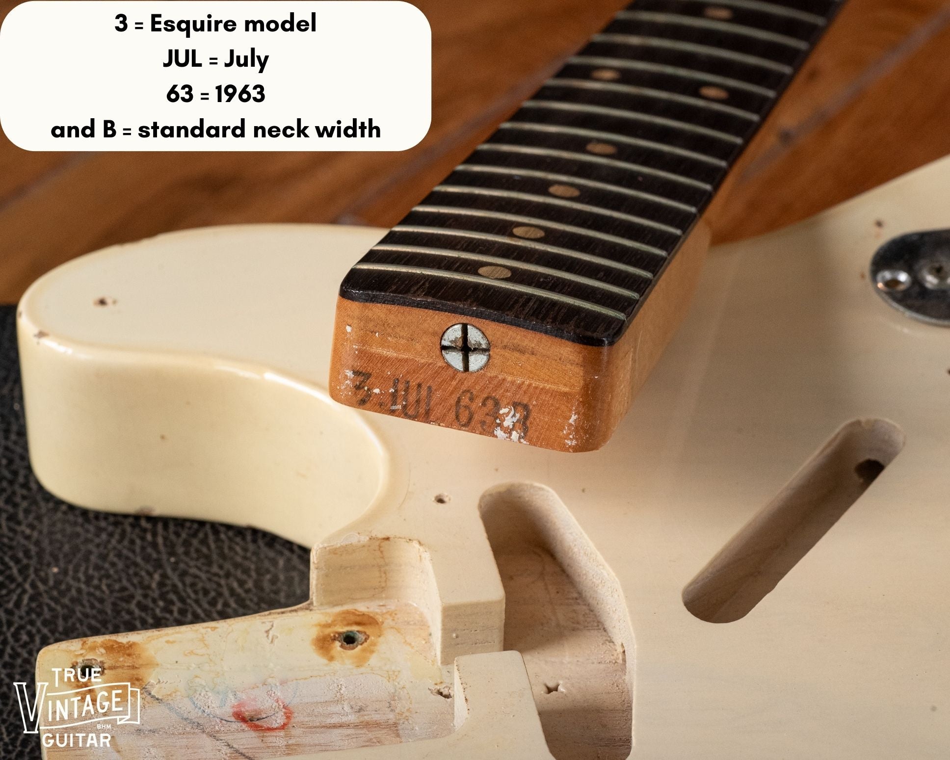 This 1963 Fender Esquire in original Blond finish has survived in very clean condition and is 100% original throughout. I was thrilled to find that it still has its factory frets and crowns with very little wear! I personally loved the mailbox letters applied by its original owner, but would be happy to remove them for you if you prefer.