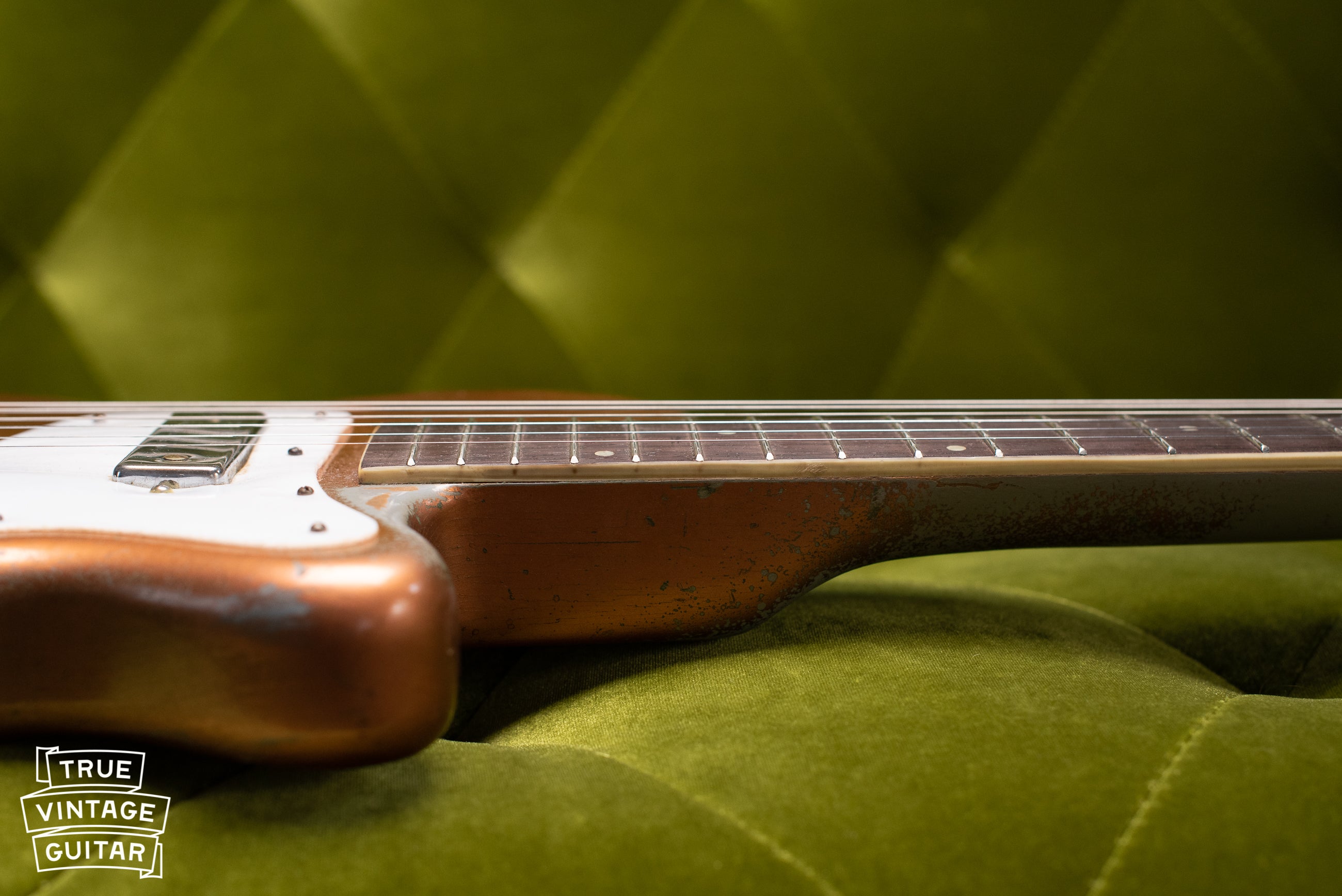 Specifications: Single cutaway, neck through Poplar body, "lustrous, copper-bronze coating" finish, single DeArmond pickup, switchable tone pot on/off. 25 1/4" scale length neck, 1 3/4" nut width, .86" neck depth at the first fret, 1.2" depth at the 12th fret.