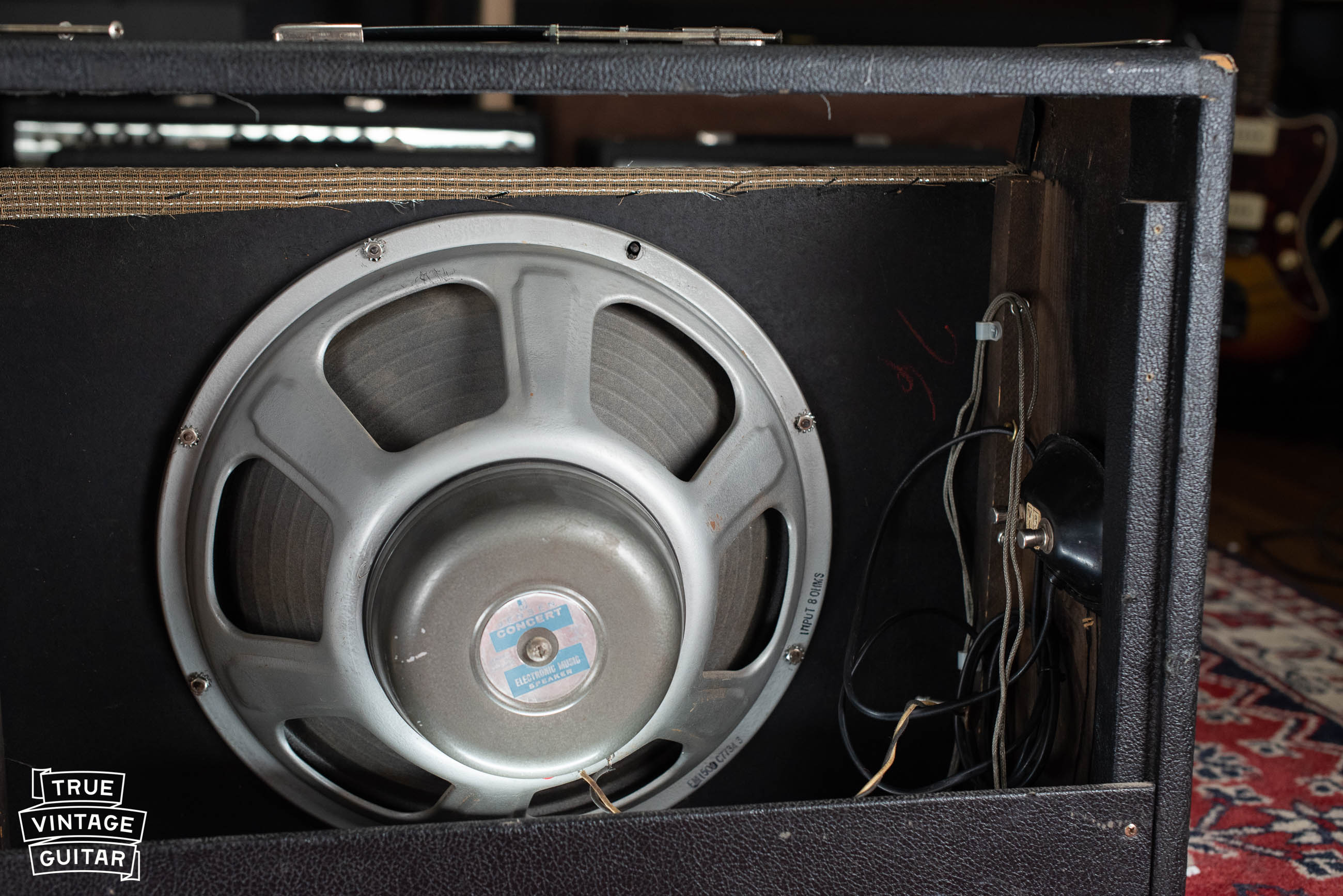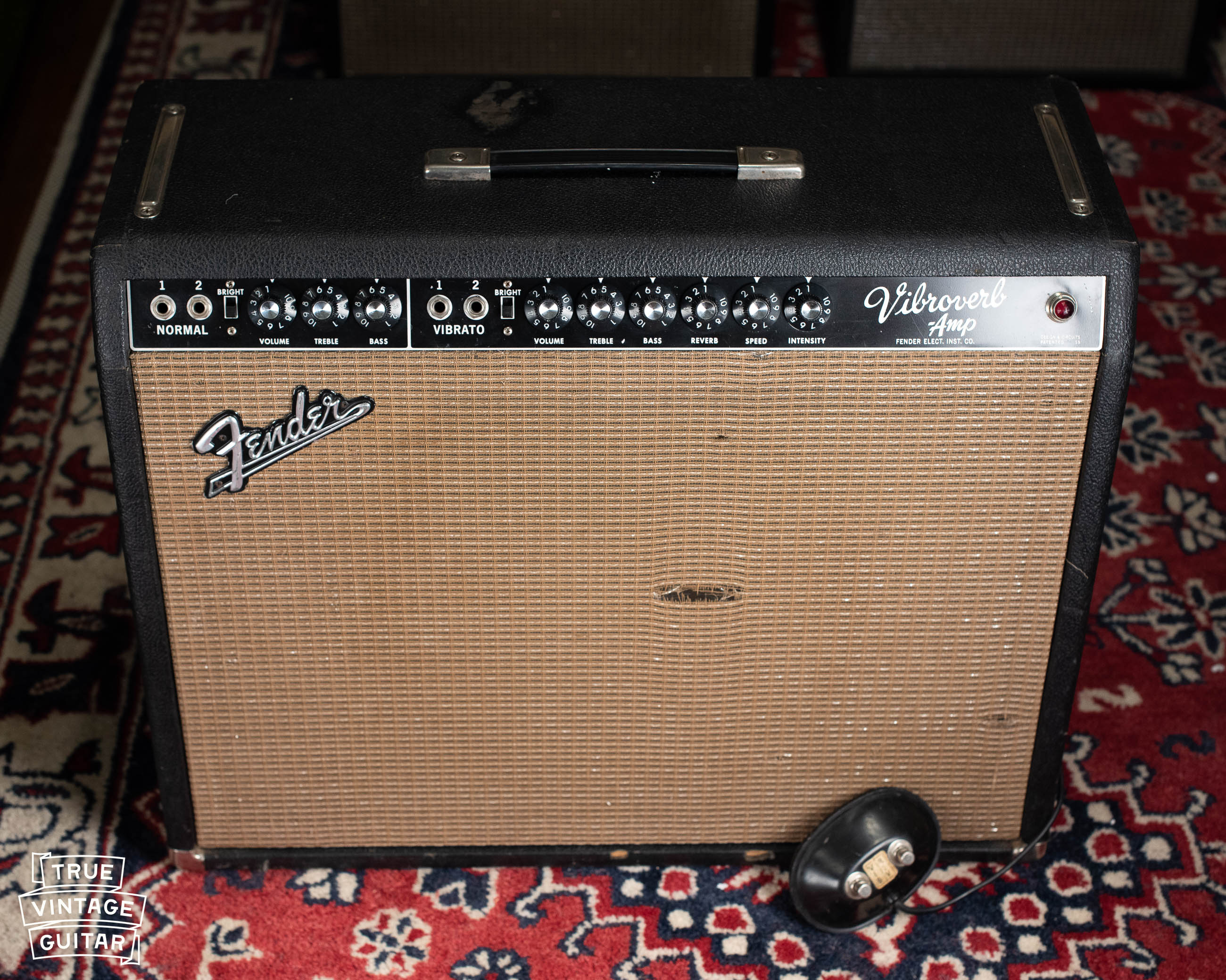 Originality: Warranty replacement Jensen Concert 15" speaker in 1966. Recent service included new filter capacitors, a few capacitors in the vibrato circuit, bias resistor, and grounded power chord. All transformers are original to the amp with correct date codes. Velcro has been added to the side wall to mount the original footswitch.