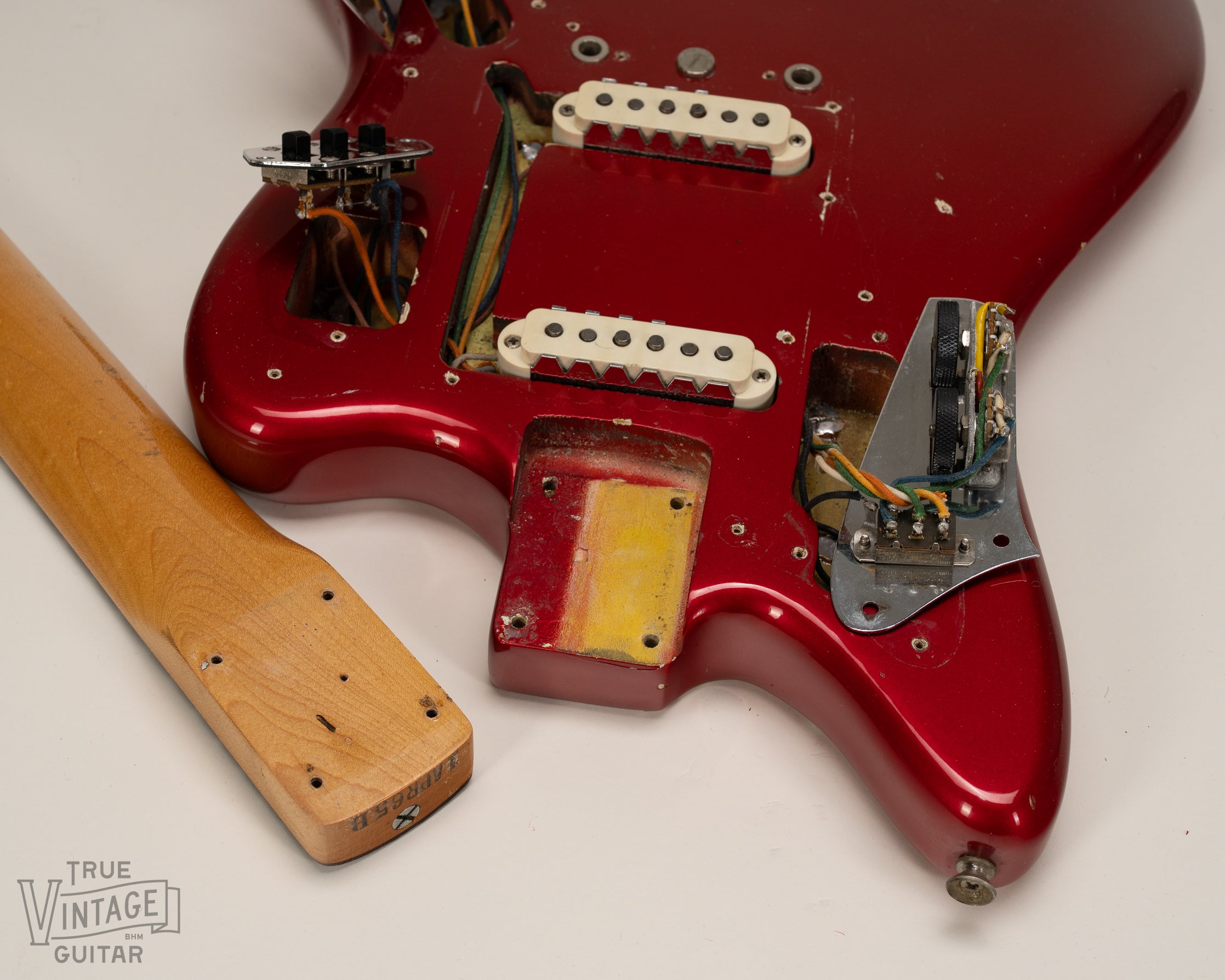 Dates: The neck heel stamp reads "1APR65B" (1 = Jaguar model, APR = April, 65 = 1965, and B = standard neck width). The potentiometer codes read "304 6508" (304 = Stackpole, 65 = 1965, and 08 = 8th week of the year).