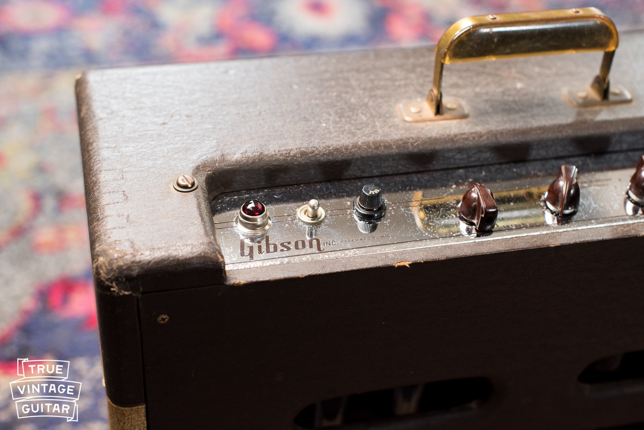 Condition: Good! The exterior covering is dirty and worn but the interior is very nice and original. The control panel exhibits typical spots of corrosion. The raised gold Gibson logo has some cracks.