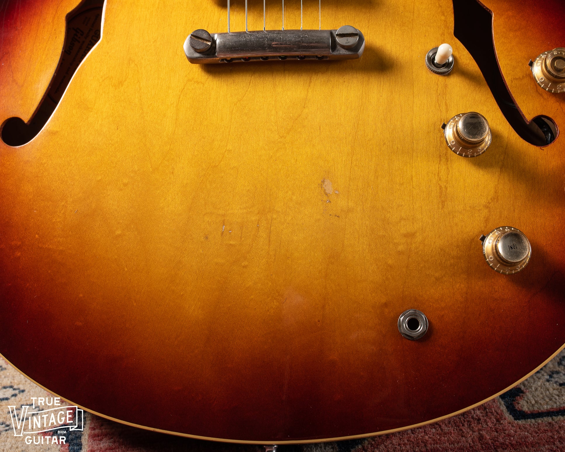 Originality: All finish, solder, and parts appear to be original to this guitar except for the metal saddles (likely 70s) in place of the original nylon. The case is a 70s Gibson 335 case.