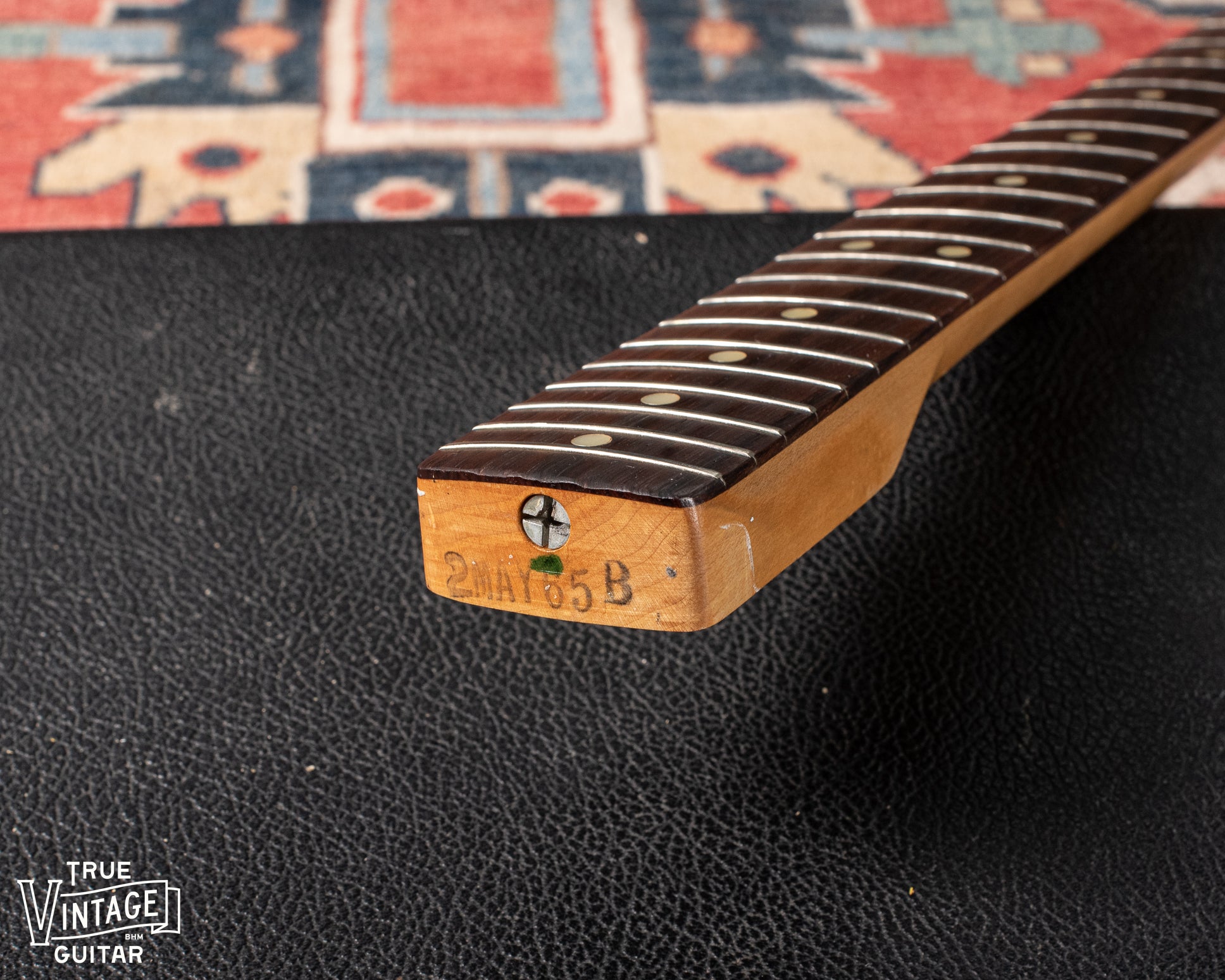 Year: 1965. Serial number "L37841", neck heel ink stamp "2MAY65B" (2 = Stratocaster model, MAY = month, 65 = 1965, and B = standard neck width 1 5/8"). Potentiometer code "304 6516" (304 = Stackpole, 65 = 1965, and 16 = 16th week).