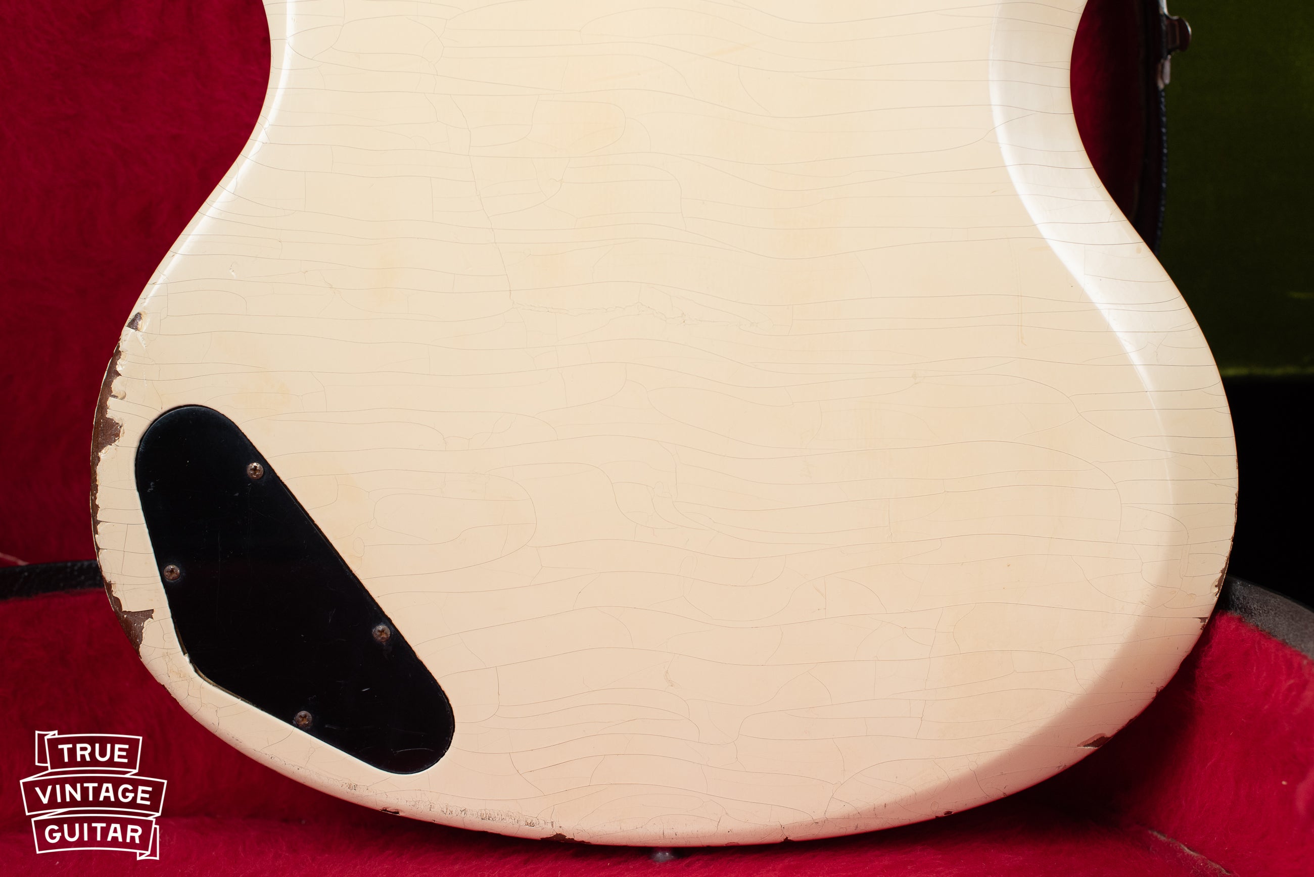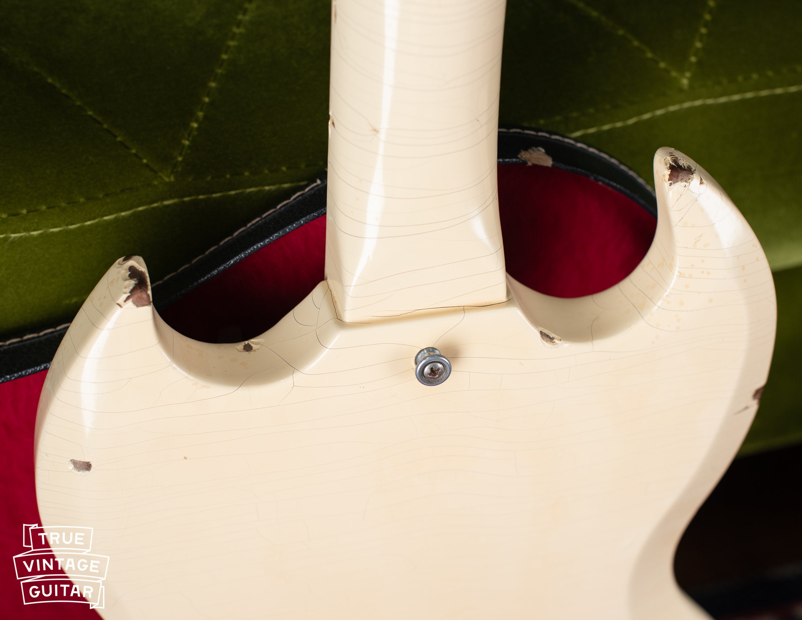 Gibson's SG TV model electric guitar, often referred to as an SG Junior in Polaris White finish, was offered in the price list from 1962 until 1968. "White" was the standard finish listed for the model along with its single P-90 pickup and Gibson Vibrola tailpiece. It featured the wider 1 11/16" nut width until late 1965.