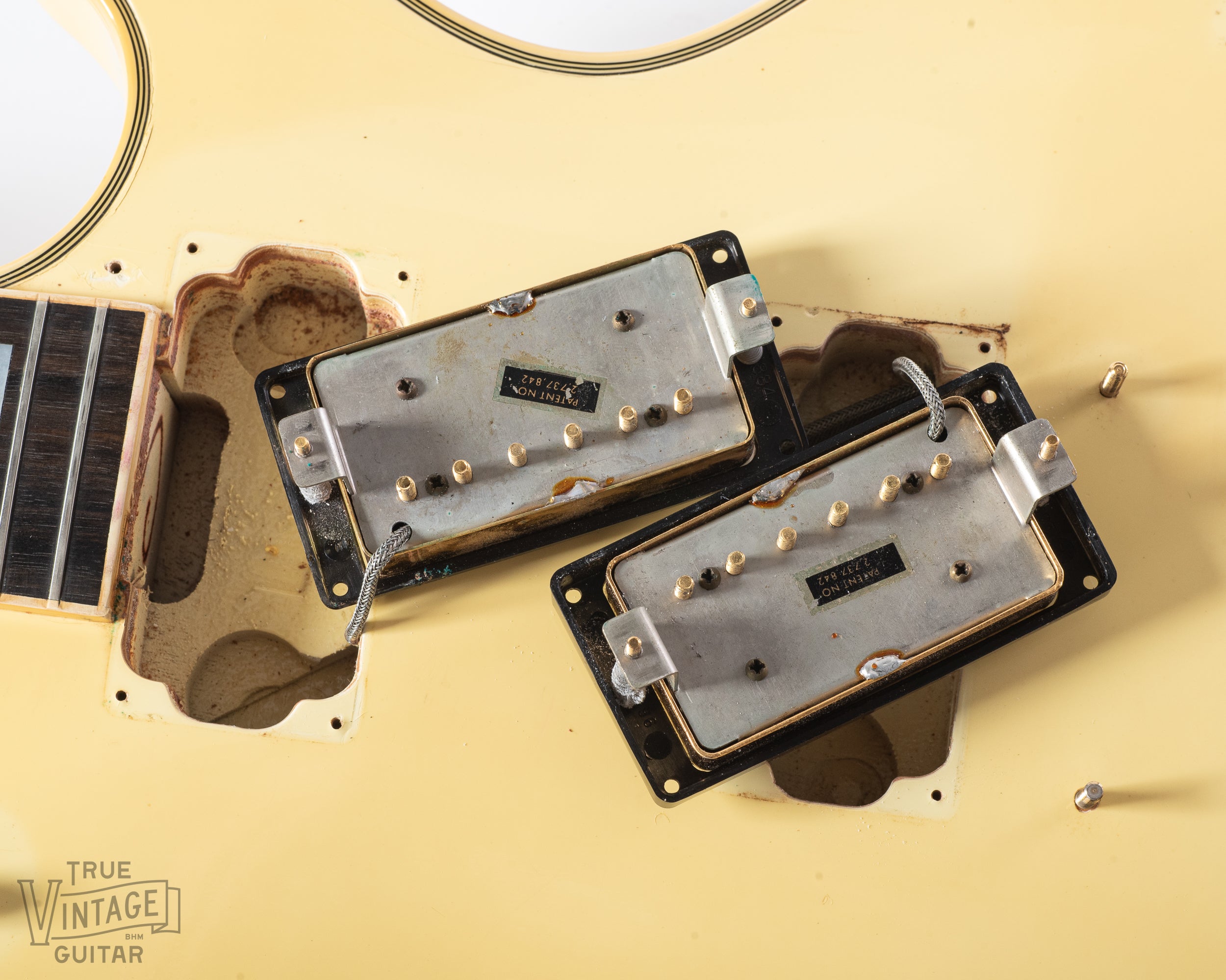 Originality: All parts, finish, and solder appear to be original to this guitar. The original nut appears to have been reseated showing a lacquer line on the side. The humbucker covers have never been opened and the original Fretless Wonder frets are original with light wear.