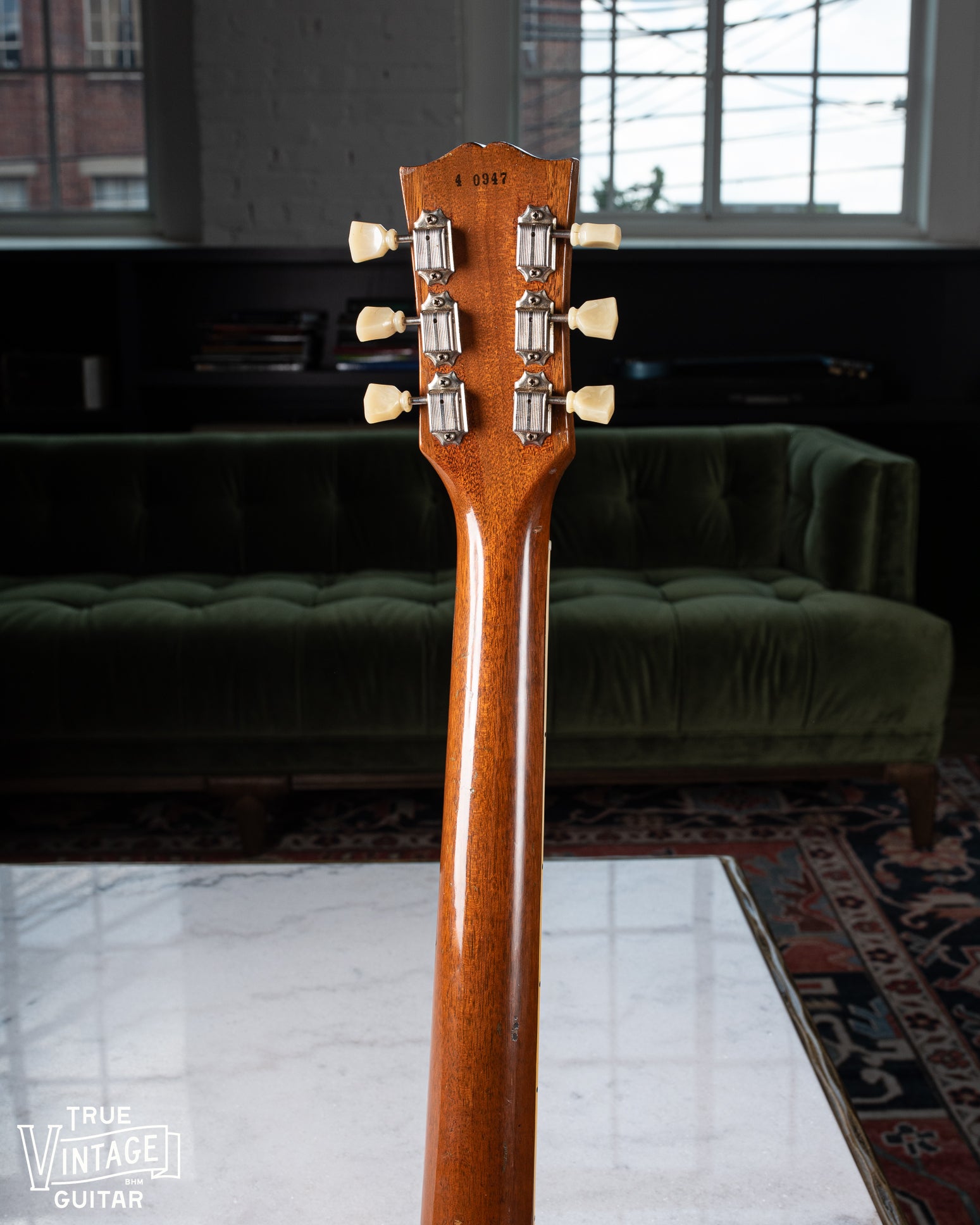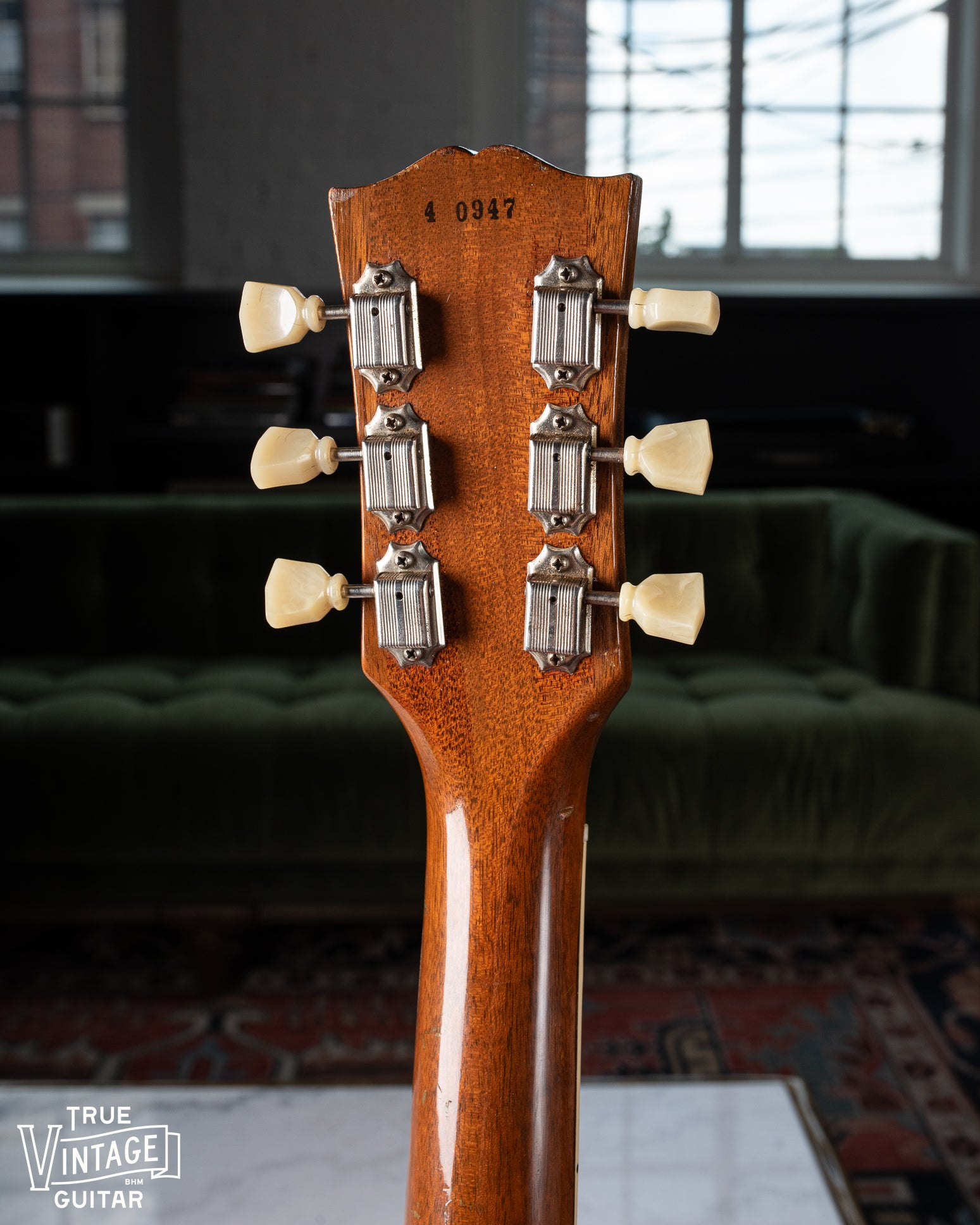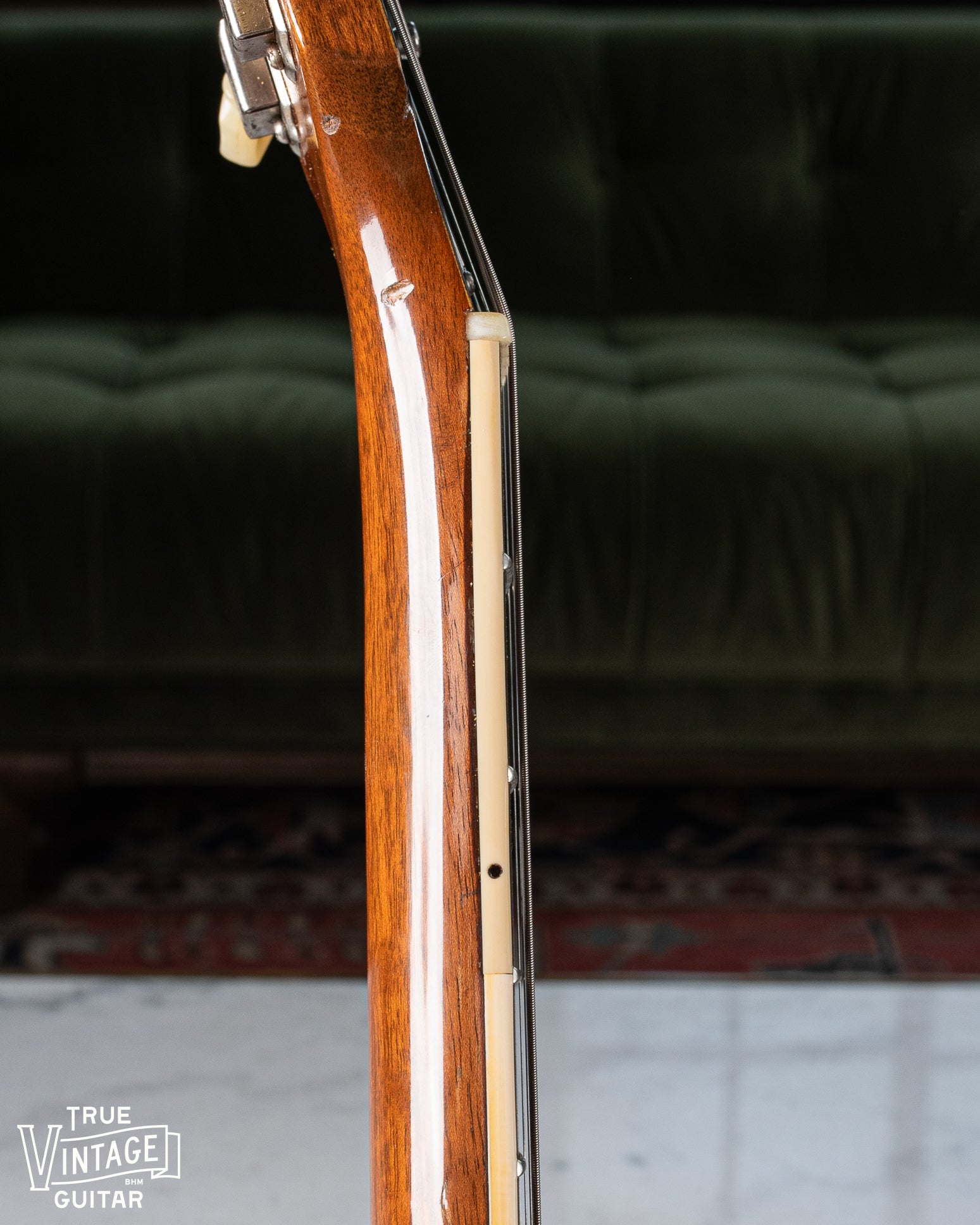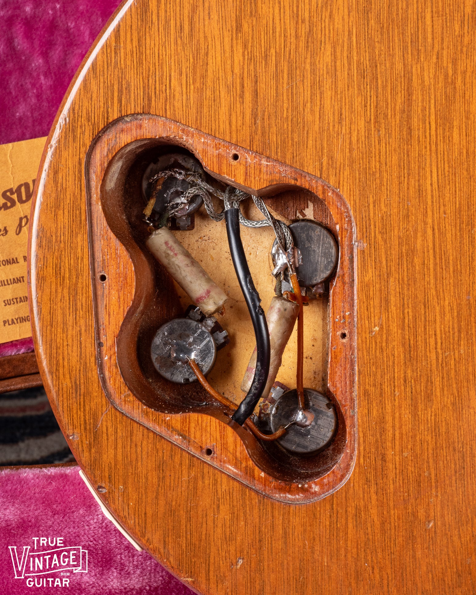 Originality: Refret over the binding, new bone nut, replaced bridge post bushings, 3" binding repair on the bass side of the neck near the nut (pictured), and a reproduction output jack plate. The ground solder joints in the control cavity have all been reflowed, but the leads from the pickups and capacitor joints are original. I've seen ground solder reflowed on other guitars in an erroneous attempt to find the source of a hum which may explain this. I'm confident that the pickups, pots, and capacitors are original to the guitar.