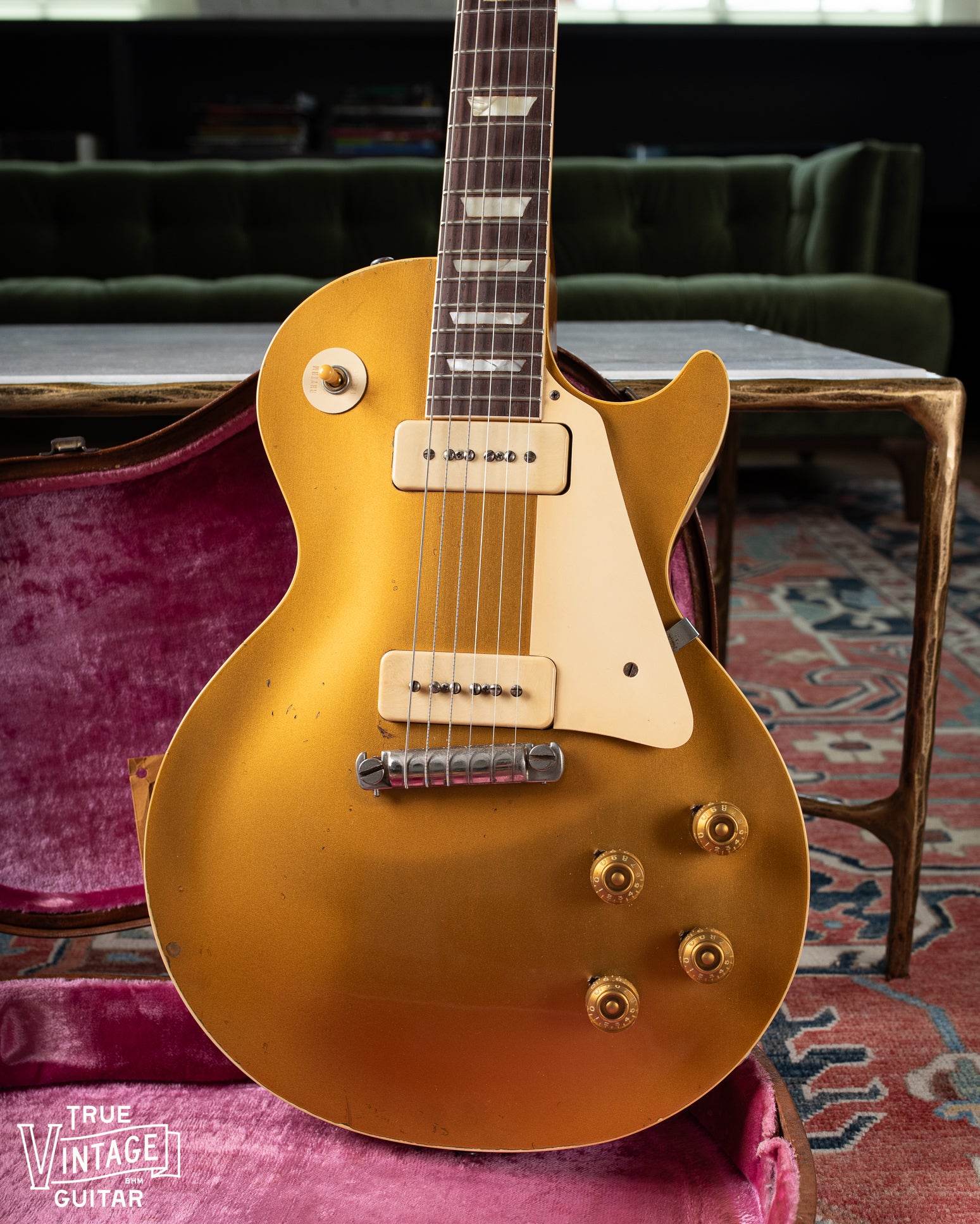 This 1954 Gibson Les Paul goldtop is one of the best playing 50s Les Pauls I've ever been privileged to play. It's original apart from a refret, new bone nut, replaced bridge post bushings for perfect geometry, short section of binding on the neck repaired (3"), and a reproduction jack plate. The original gold finish shows light wear which is catching the light in my photos but appears much more subtle in person. I purchased it from the daughter of its previous owner after he passed recently.